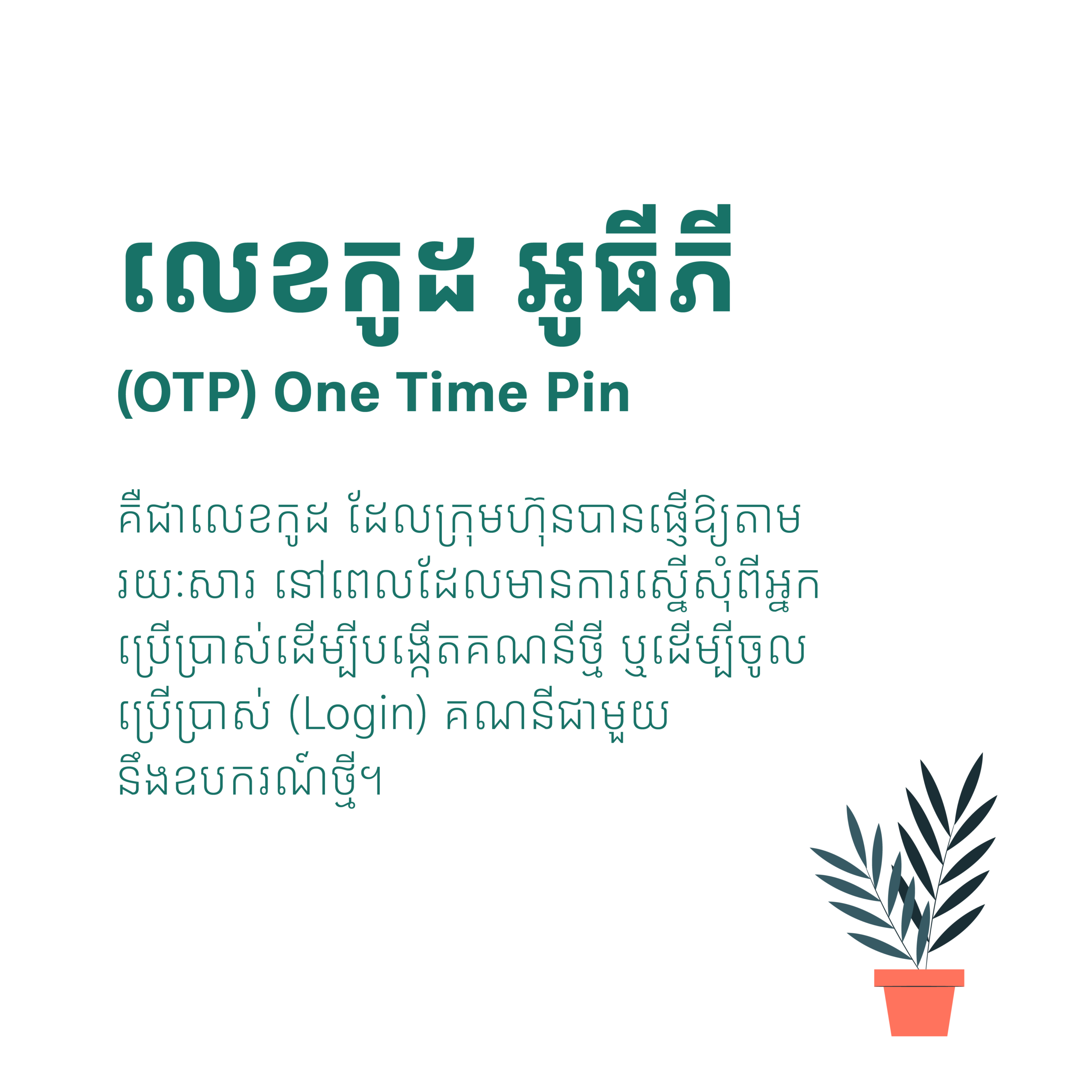 ក្រែងយើងមិនស្កាល់អ្វីទៅជា OTP ពាក្យថា OTP នេះគឺមកពីពាក្យពេញមានន័យថា One-Time Password ឬ លេខសម្ងាត់ប្រើបានតែម្តង។ វាជាលេខកូដខ្លីៗ (ភាគច្រើន 4–6 ខ្ទង់) ដែលប្រព័ន្ធផ្ញើមកអ្នក តាម SMS, WhatApps, Telegram ឬ Email ដើម្បី បញ្ជាក់ថា “អ្នកគឺជាម្ចាស់គណនីពិត”។