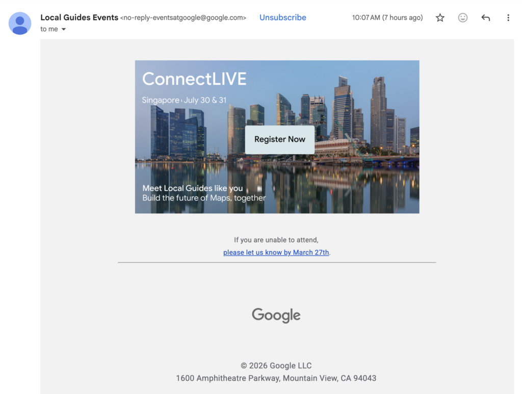 ហើយសម្រាប់អ្នកដែលកំពុងស្ទាក់ស្ទើរ ខ្ញុំចង់លើកទឹកចិត្តថា សូមកុំរង់ចាំឱកាស មកពីក្រៅ។ ចាប់ផ្តើមធ្វើពីថ្ងៃនេះ។ ចាប់ផ្តើមចែករំលែក ចាប់ផ្តើមរៀបចំ Meetup ចាប់ផ្តើមកែផែនទីនៅតំបន់របស់អ្នក នៅលើ Local Guide Connect ថ្ងៃនេះ អាចក្លាយជាឱកាសធំថ្ងៃក្រោយ ប្រសិនបើអ្នកបន្តសកម្ម និងបន្តចែករំលែកដោយស្មោះត្រង់ ខ្ញុំជឿថា ឱកាសនៃការទទួលការអញ្ជើញនៅឆ្នាំក្រោយ អាចជារបស់អ្នក។